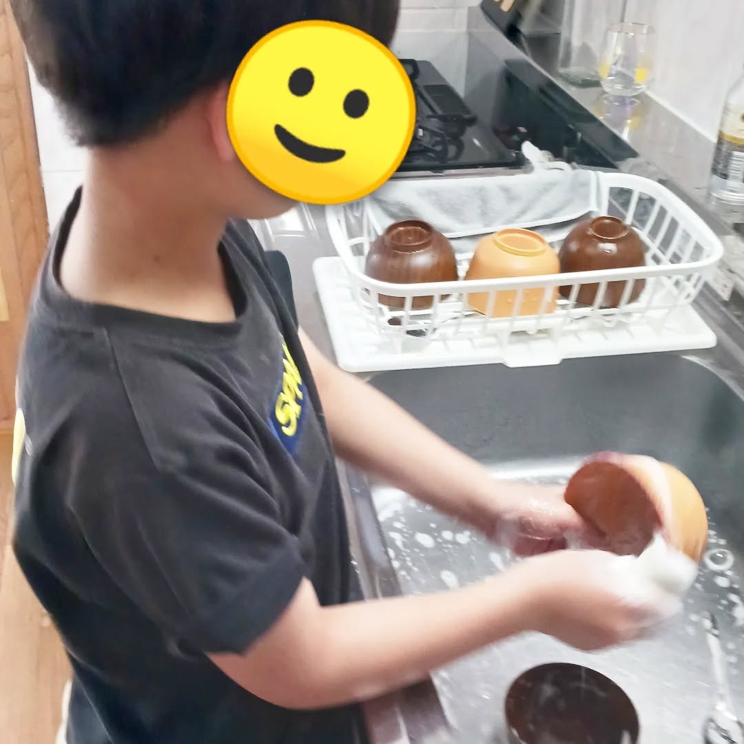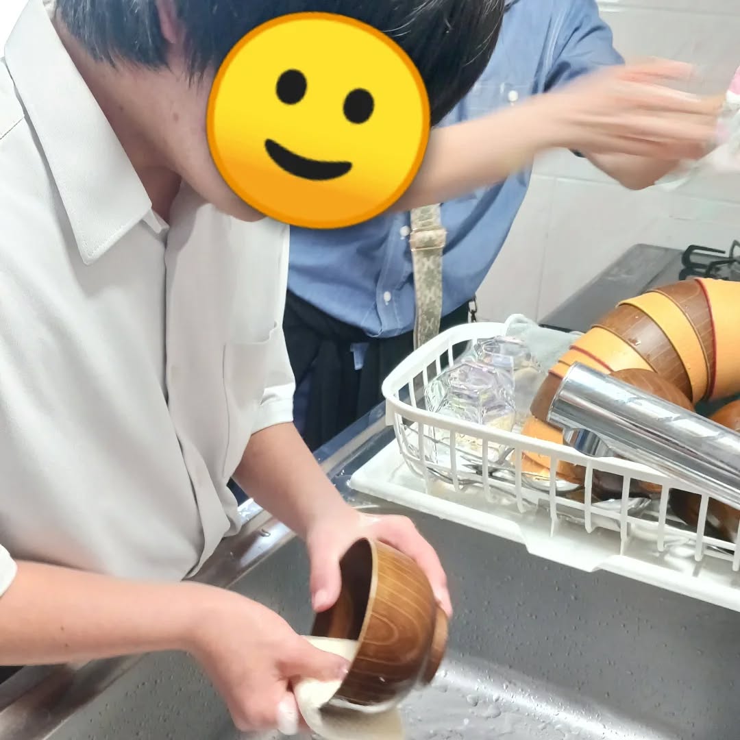 生活動作、就労動作の習得に向け、食器洗いトレーニングを行いました。(1)姿勢や準備、(2)両手の使い方 (3)手内操作 (4)力の調整 を意識してもらいました。始める前に、シンクとの距離間の確認や、身体をしっかり両足で支えて立つ、洋服のそでをまくるなどを確認し、手の動きに意識が向くよう大きめの洗濯ばさみで少し運動をして感覚を入れてから、スポンジとお椀を持って洗う練習しています!