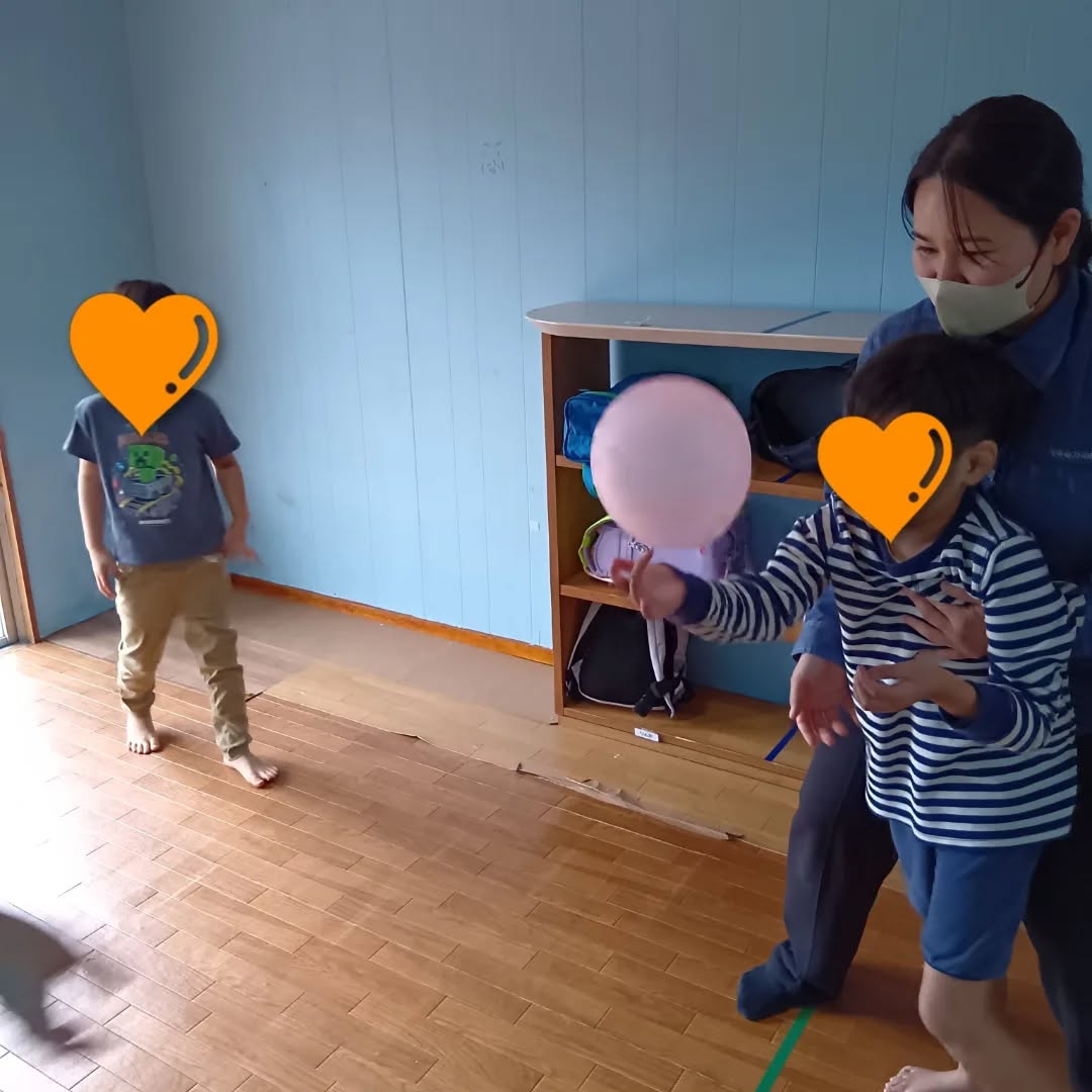 お友達と、風船を手でポンポン❗️下から優しくタッチして落とさないように、みんなで協力します☺